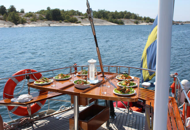 Att servera en lyxmåltid är att kombinera en fulländad meny med en tilltalande uppläggning så att ögat konfirmerar smakupplevelsen. Vi lagar all vår mat ombord av de allra bästa råvarorna. På frukostbordet står alltid nybakat bröd. Eftermiddagens fikabröd kommer direkt från ugnen och har senaste timmen retat vårt luktsinne.